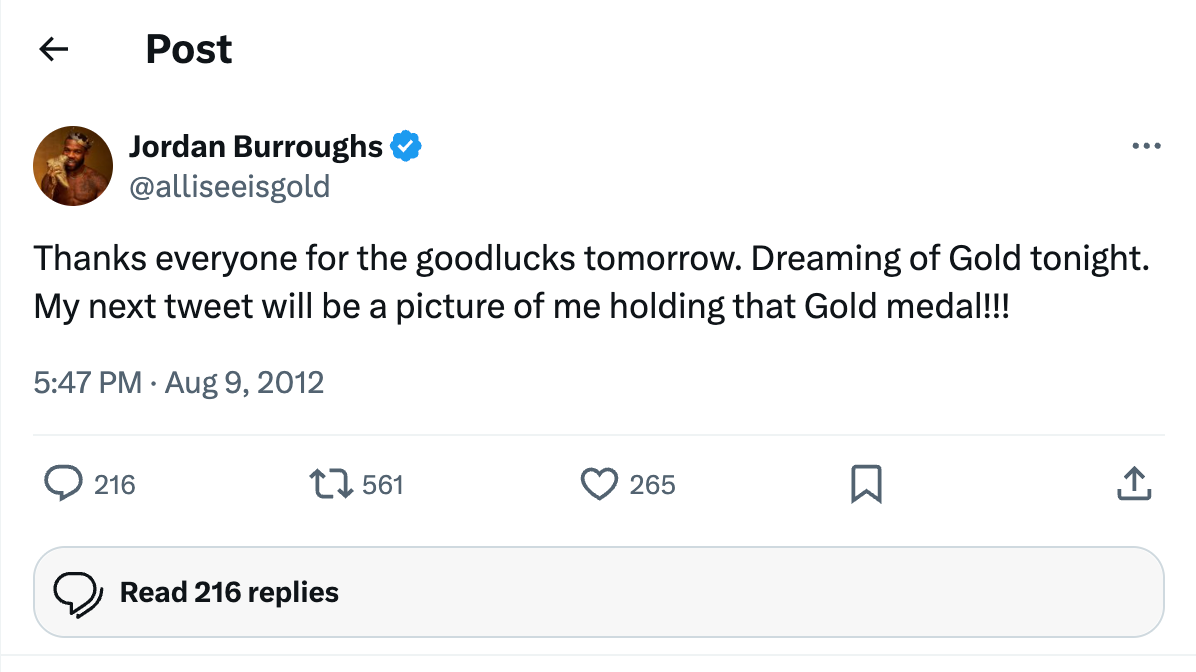Burroughs still remembers what song was playing after the match was over, as well: “I Gotta Feeling” by Black Eyed Peas. He was smiling by that time, with an American flag draped across his back. Pretty soon he’d have a shiny gold medal around his neck, too—and a triumphant new picture to post on social media. 🗣️
